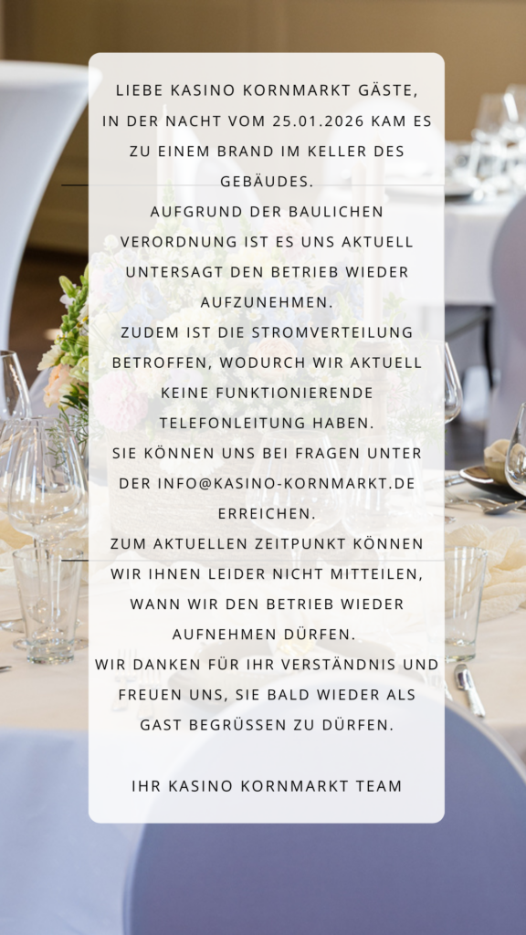 Die Karten die im Kasino Kornmarkt gekauft werden, können gerne bei uns zurückgegeben werden. Bitte melden Sie sich per Mail bei uns, wir werden dann eine Lösung finden.